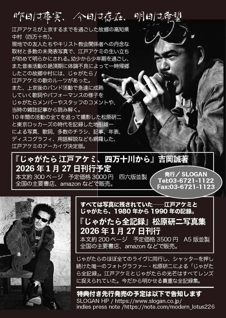 なお、じゃがたら写真集の増補復刻版『じゃがたら全記録 松原研二写真集』も2026年1月27日(命日)に同時発売。